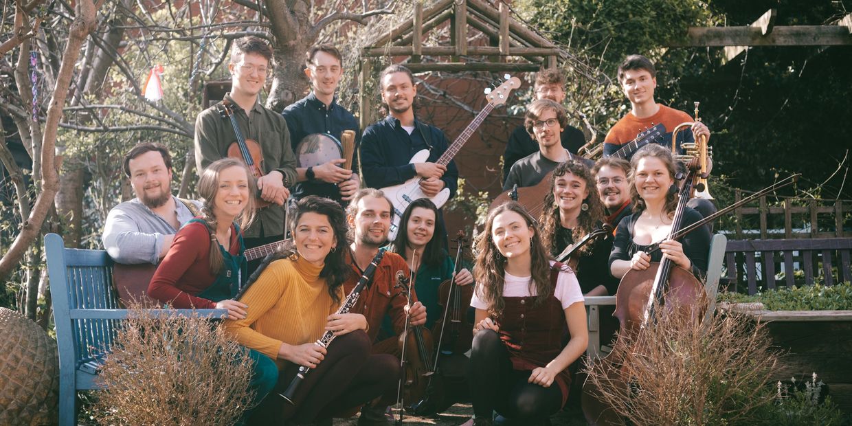 Filkin’s Ensemble is the bold vision of Seth Bye and Chris Roberts (aka. Filkin’s Drift) who have recently earned widespread acclaim for an 870 mile foot-powered-tour, with national airtime on BBC Radio 2, 3, 4, 6 Music, and BBC World Service. They also achieved global attention from major news outlets including BBC News, Billboard, The i, Radio New Zealand, Canadian Broadcasting Company, and The Times. Forming Filkin’s Ensemble in 2020, Seth Bye and Chris Roberts now bring together 14 of the UK’s finest young folk musicians in an adventurous collaboration.